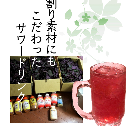 赤紫蘇サワーは、岡山産の赤紫蘇を煮出し、蜂蜜、オリゴ糖、クエン酸を加えて作った完全自家製の割材を使用。どちらも、伽羅に来たら是非一度はお飲みいただきたいドリンクです。